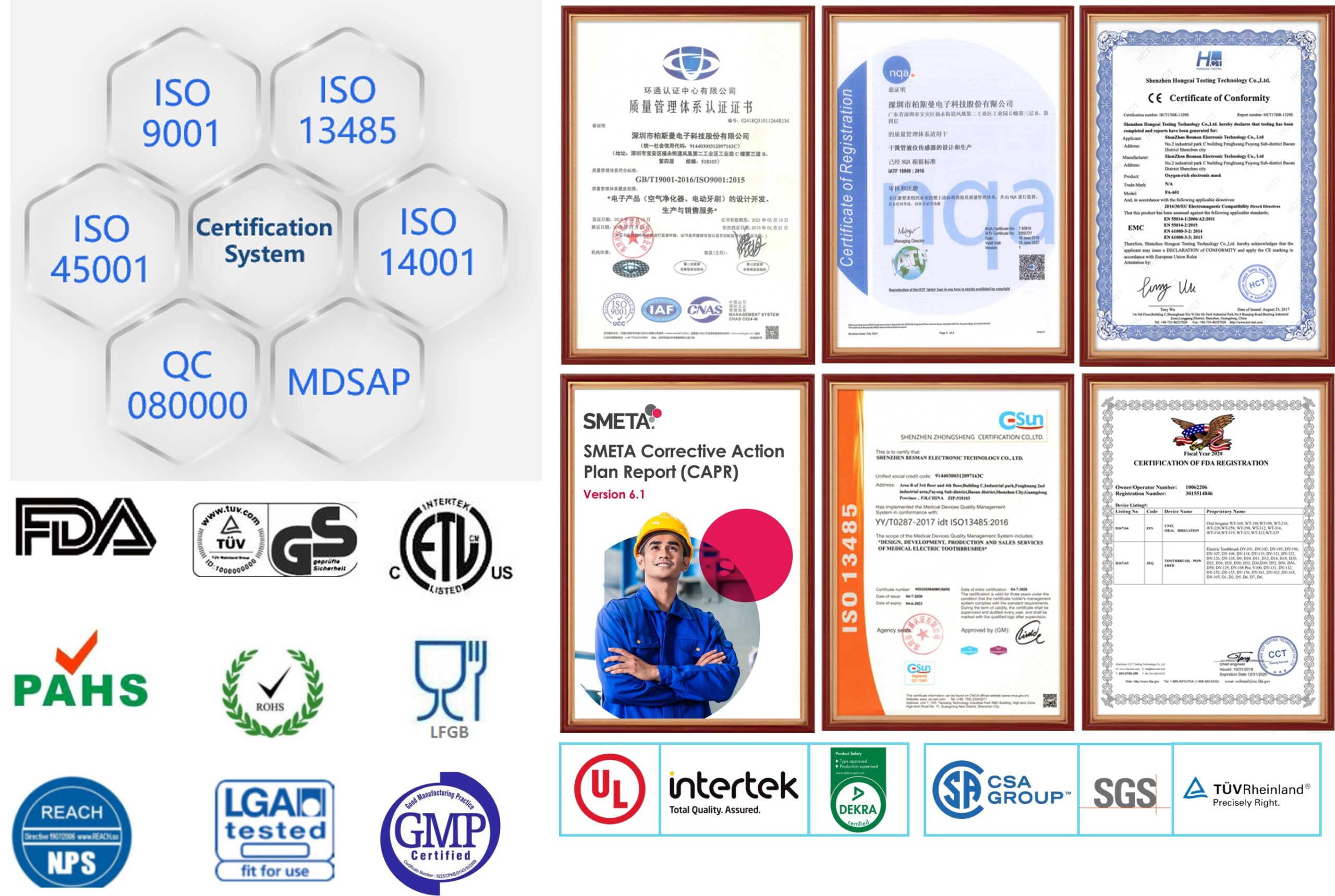 FDA, UL, FCC, GS, CE, CB, ROHS approved for global distribution.